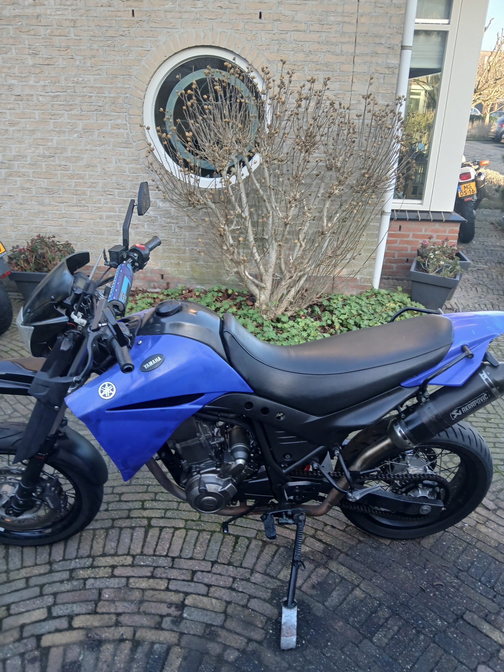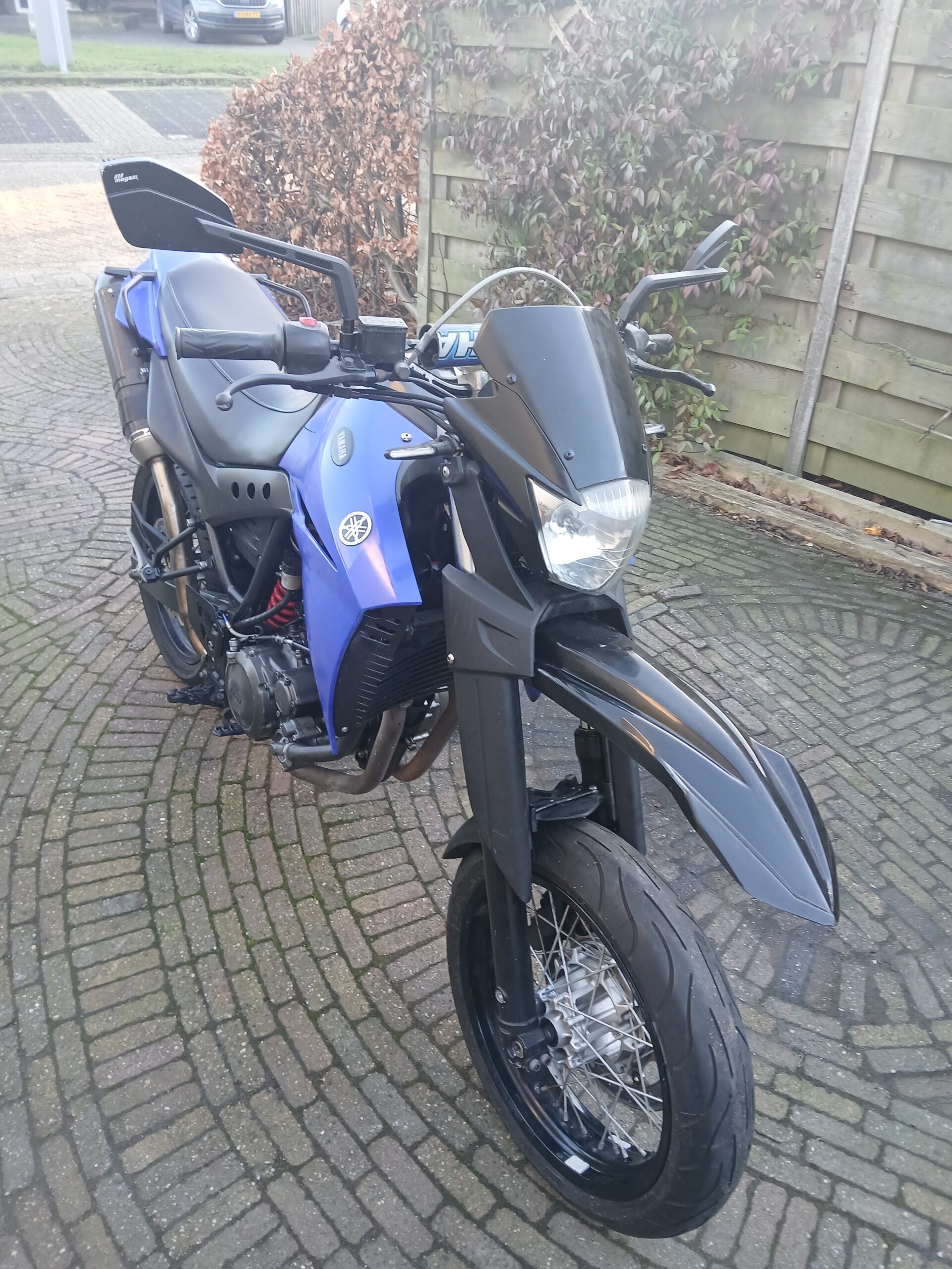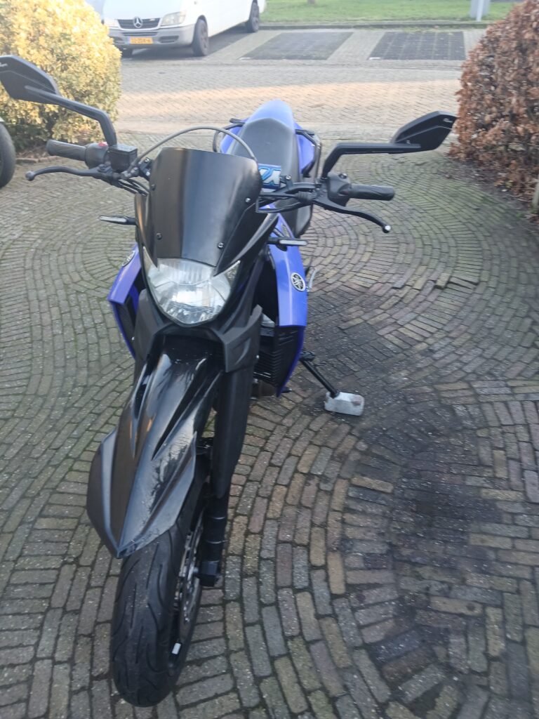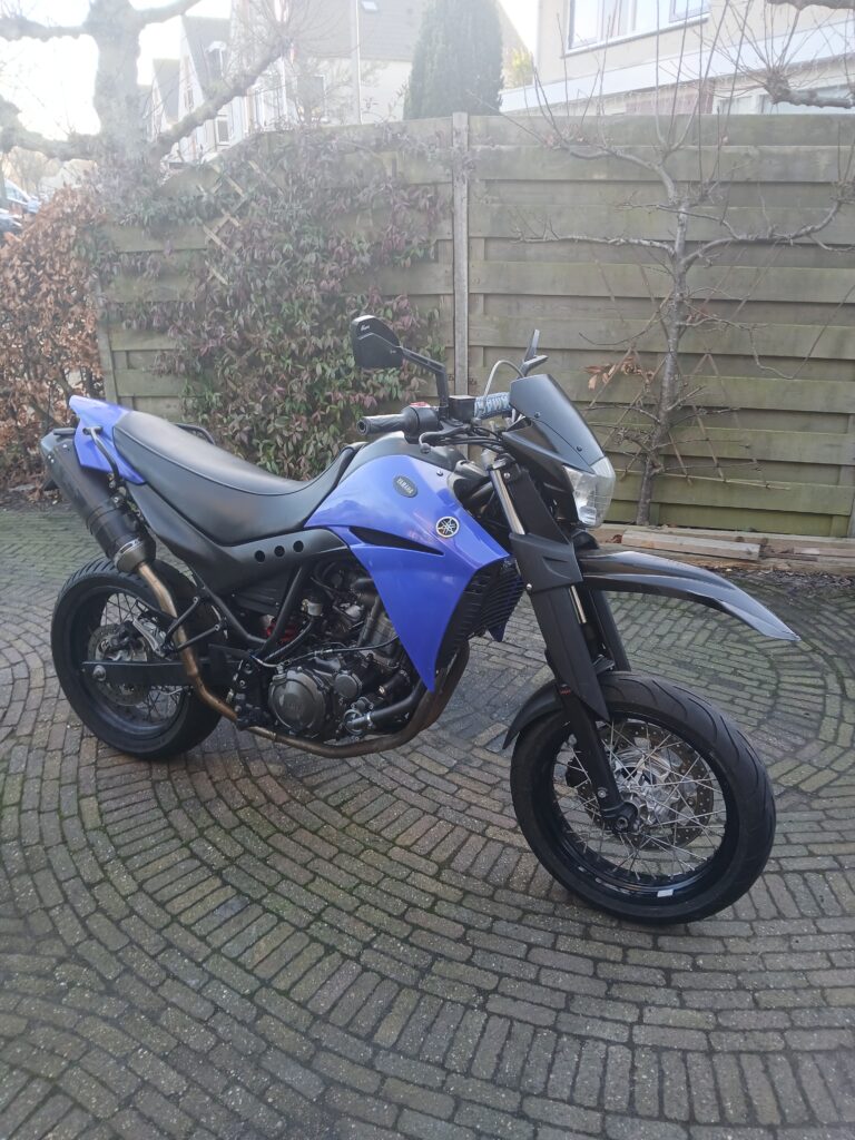 Het is een redelijk nette Yamaha XT660X , een dikke 1 cilinder, stoere motor met een machtig geluidje door de dubbele Akrapovich uitlaatdempers.