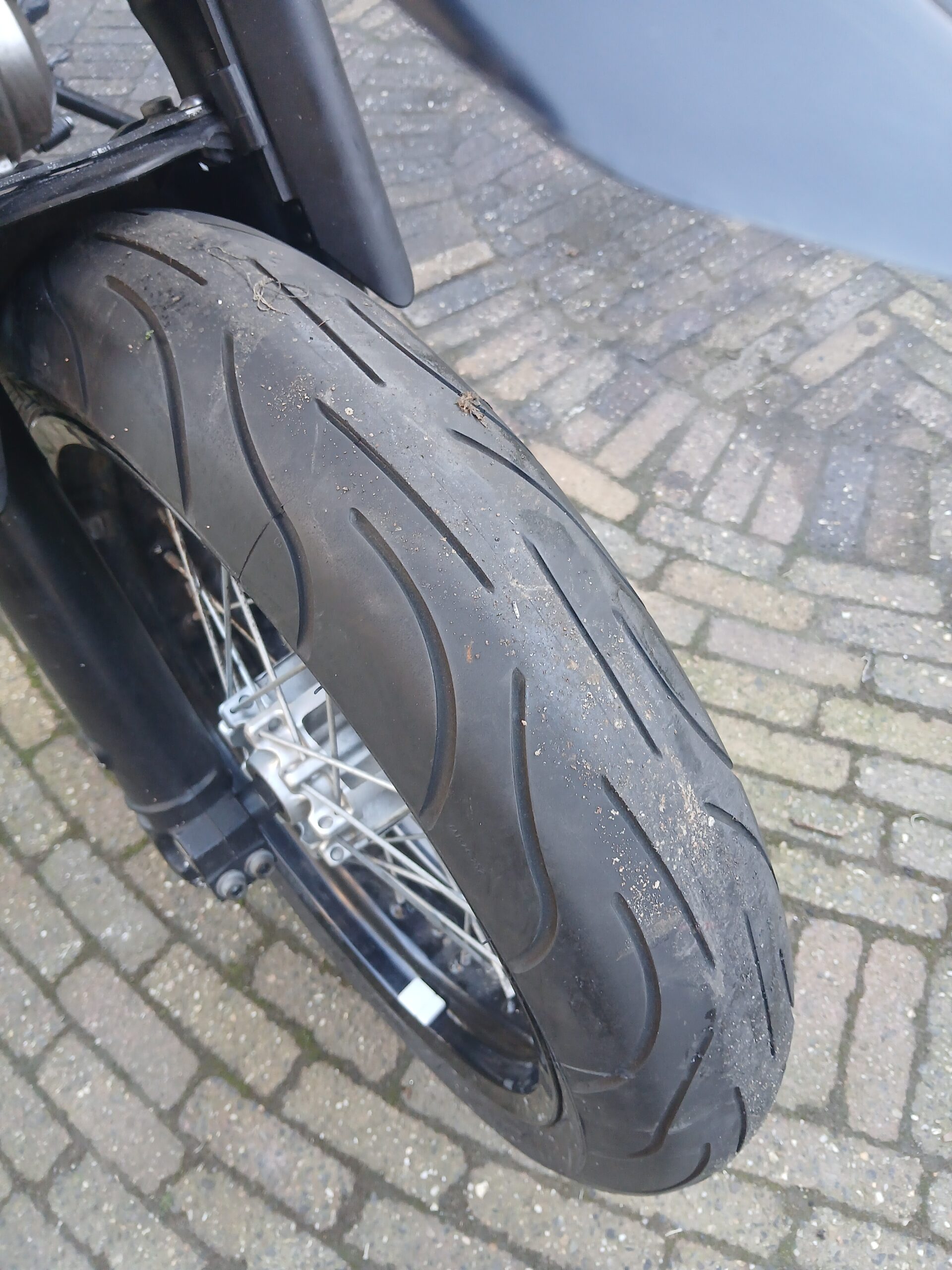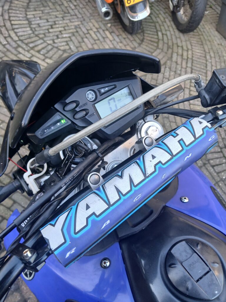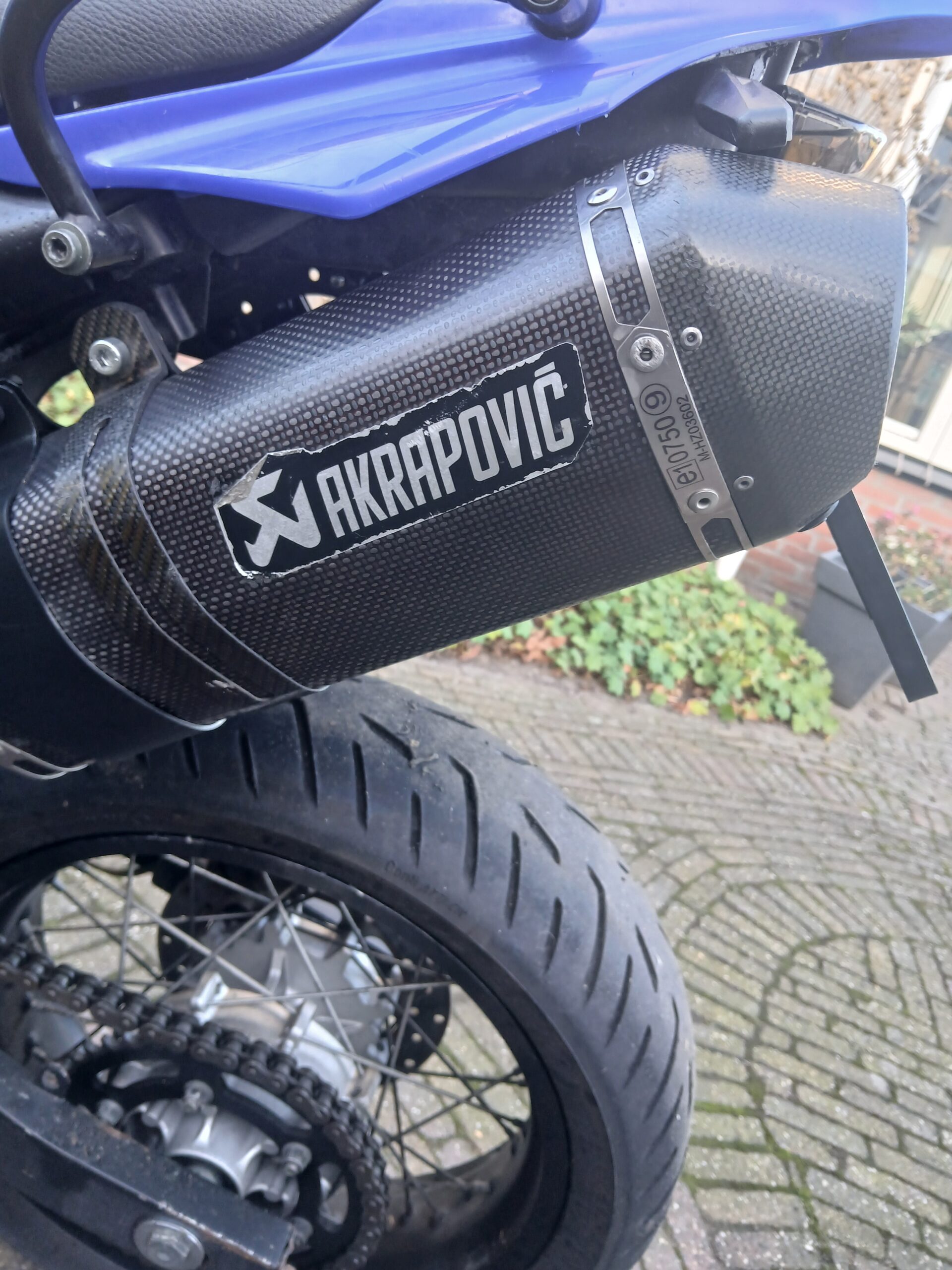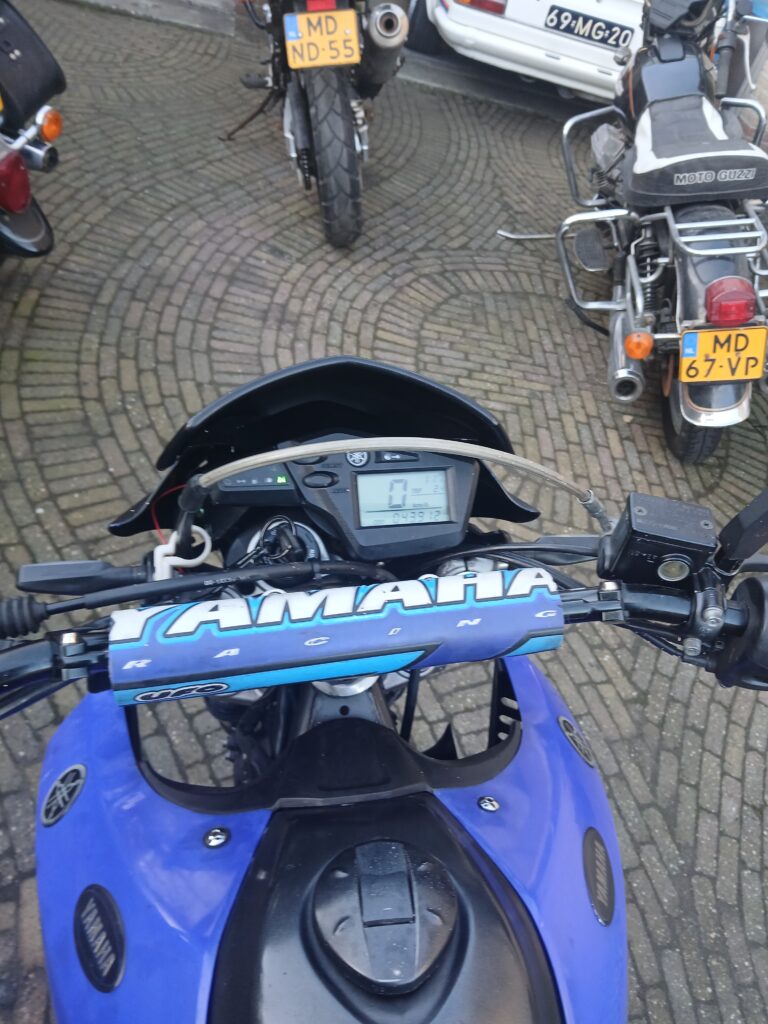 Het is een redelijk nette Yamaha XT660X , een dikke 1 cilinder, stoere motor met een machtig geluidje door de dubbele Akrapovich uitlaatdempers.